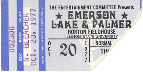 from a fan report : After the main set was over, the dynamic trio were exhausted, taking their bows before a packed house of fans madly cheering foran encore. Keith's Steinway grand piano was sitting midstage on a motorized elevating orchestra pit. Carl had failed to notice this part of the stage had been lowered. To the shock of everyone in the place, he lost his balance and fell off the stage, landing hard with his side impacting the edge of the piano.Collectively the audience gasped, OOOOH, OUCH, that looked serious! They later discovered that the Champion of Percussion had cracked a rib or two in that very public fall. But here's the best bit: After ELP took a short breather, they came out and played a dynamite encore! Pictures, as I recall. Carl's mid-section had been wrapped with a bandage, but he insisted that the show go on! He even did a drum solo as if nothing were wrong at all. He didn't miss a beat. The guy must have been enduring a lot of pain! You have to admire that kind of courage and dedication. After the encore, Greg jokingly held Carl around the shoulder like a big brother, preventing him from repeating his plunge. I later heard that ELP had to postpone a concert or two after that night to allow Carl to heal a bit before continuing the tour.